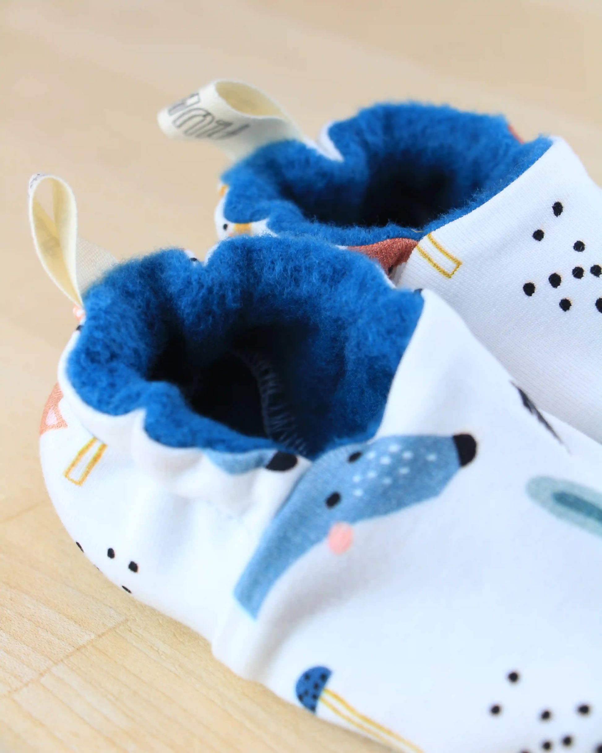 Babbucce in jersey con interno felpato. Entrambi i tessuti elasticizzati e la presenza dell’elastico sul retro rendono facile la calzatura e l’adattabilità al piede. Realizzate anche con antisdrucciolo a partire dalla taglia 2.