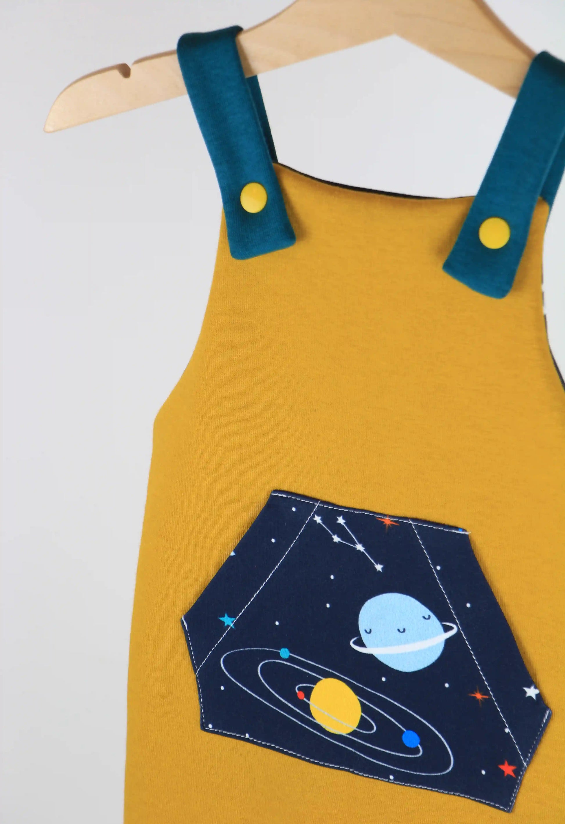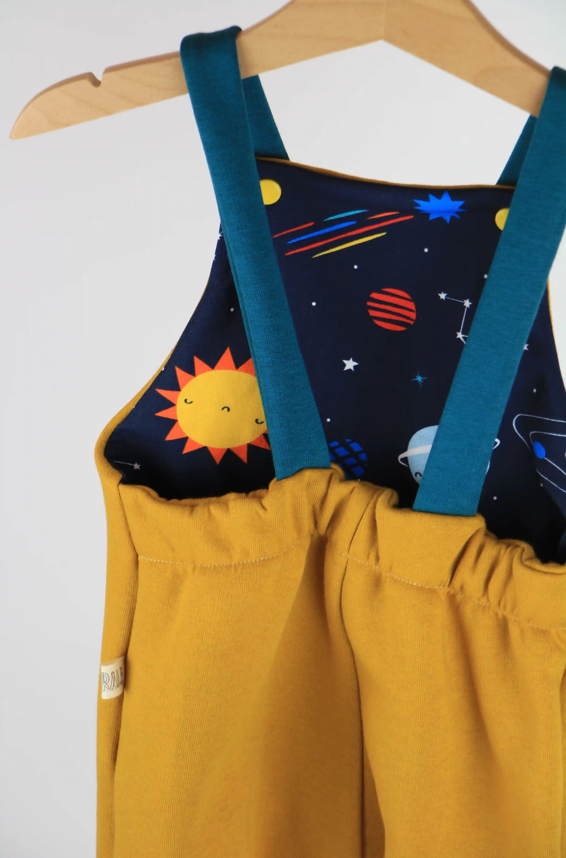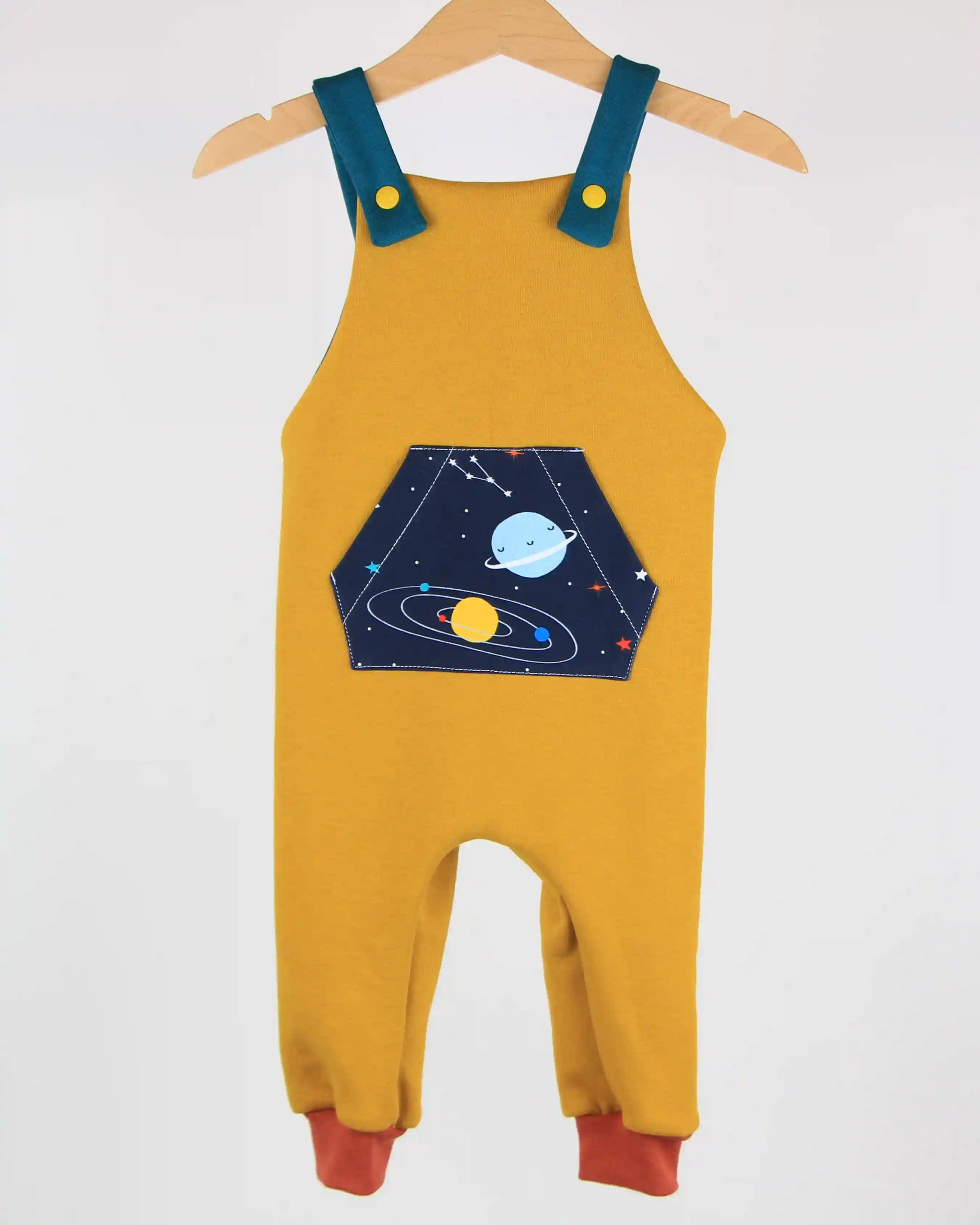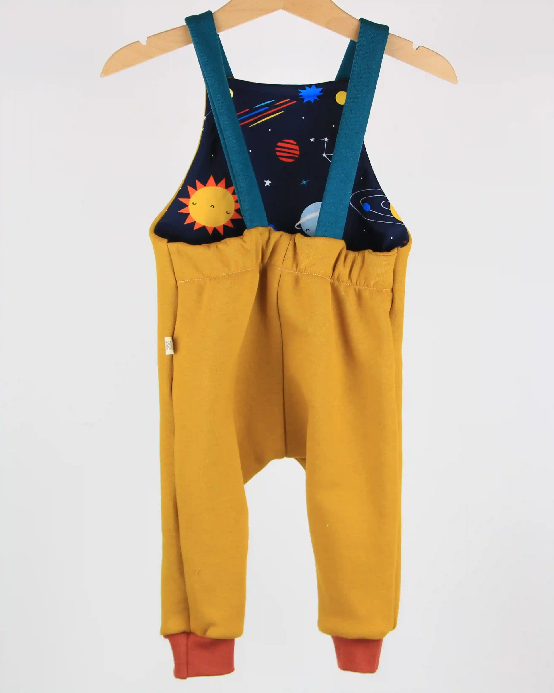 Salopette lunga in felpato di cotone morbido, adatta per qualsiasi tipo di pannolini, compresi i pannolini lavabili. Tasca anteriore ed elastico posteriore. Le bretelle si fissano sulla parte anteriore con bottoni a pressione, con la possibilità di essere incrociate sul retro per una maggiore aderenza.