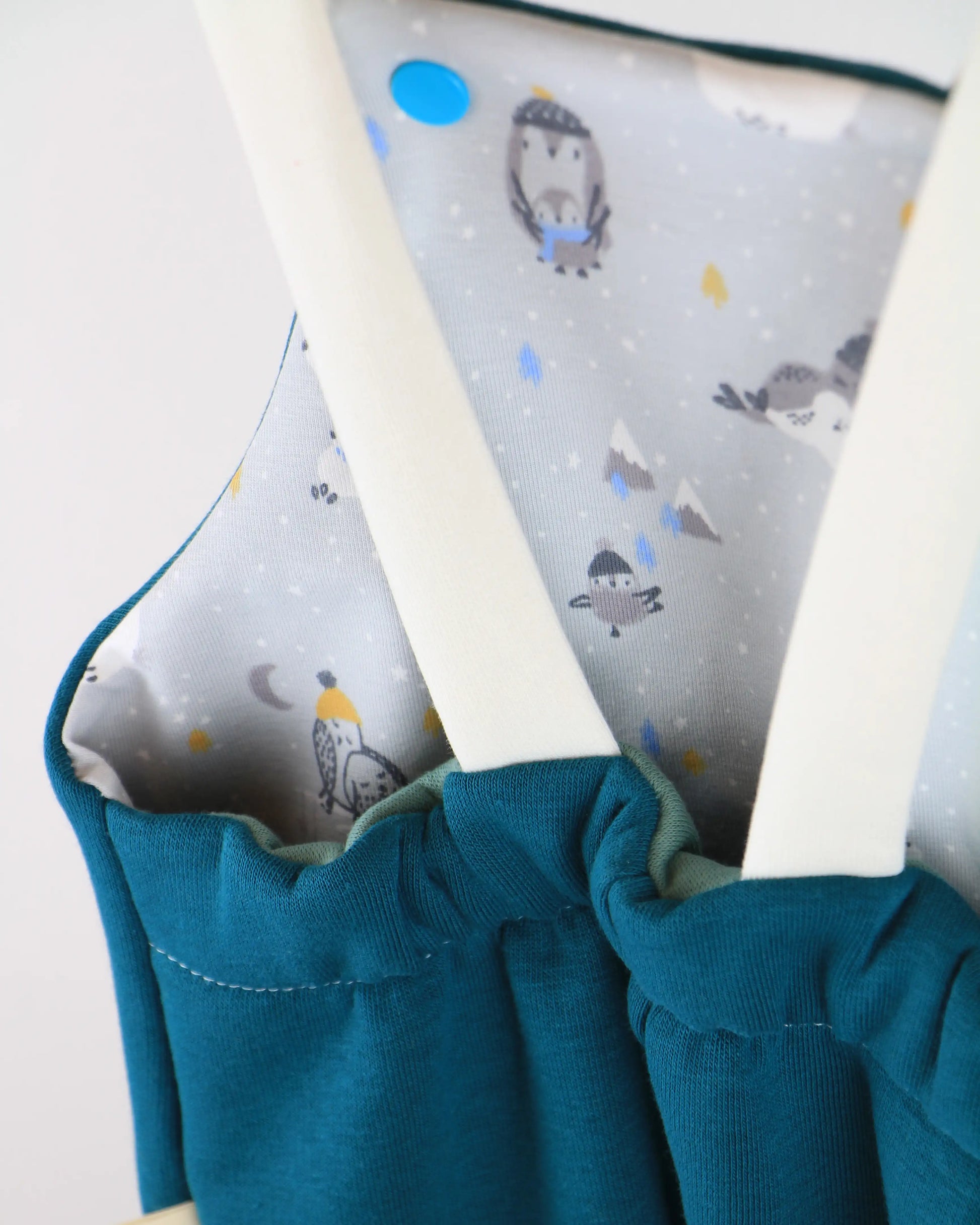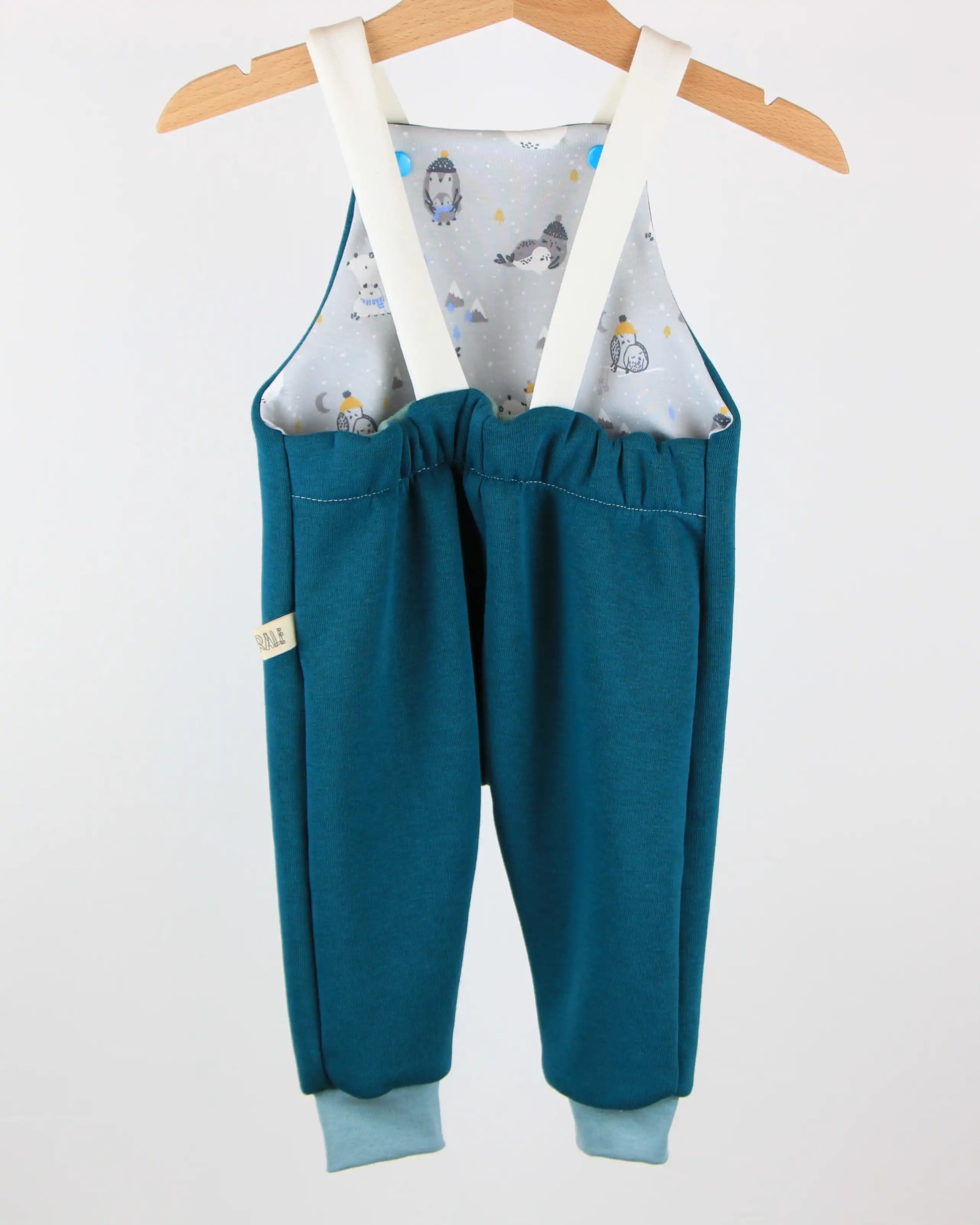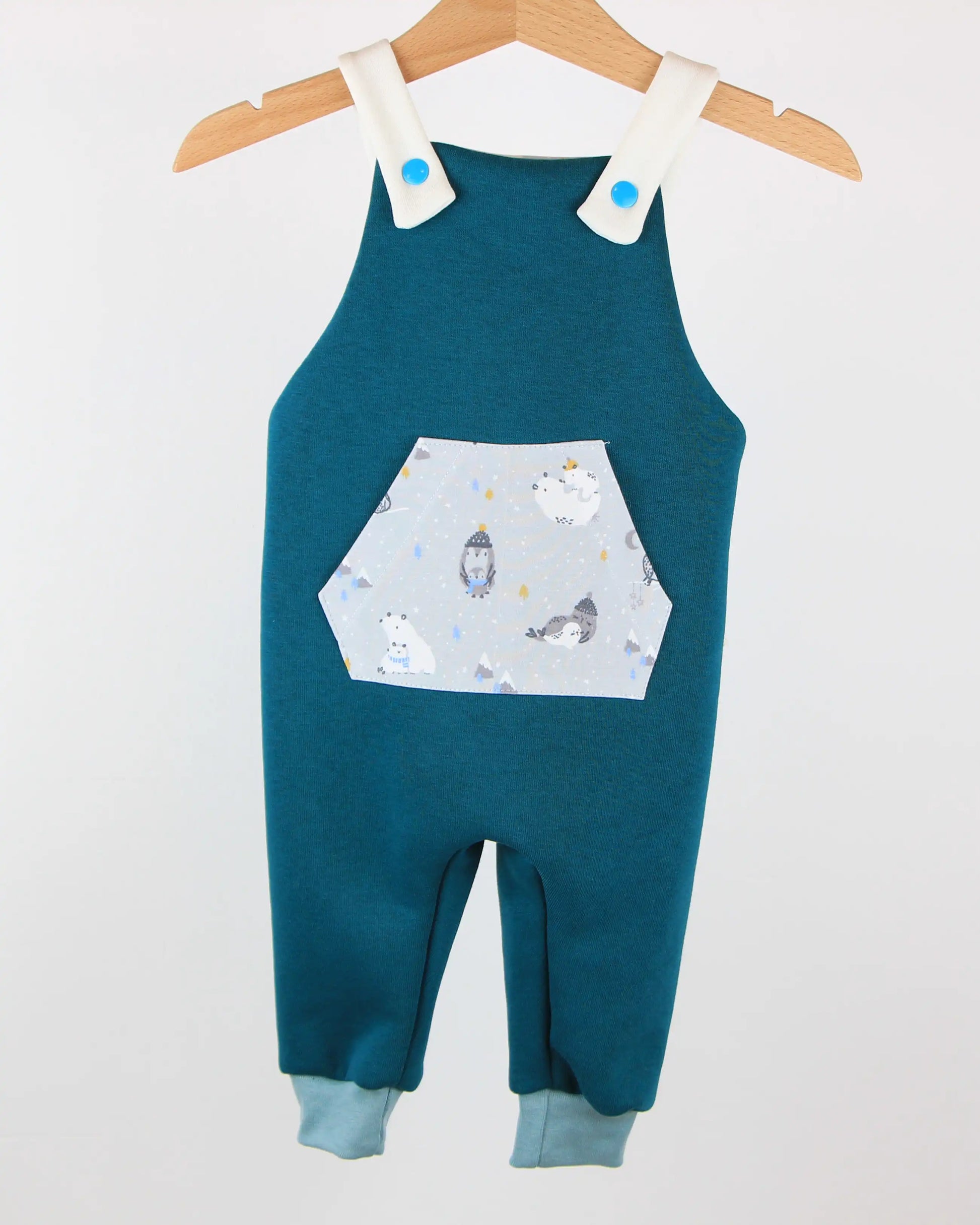 Salopette lunga in felpato di cotone morbido, adatta per qualsiasi tipo di pannolini, compresi i pannolini lavabili. Tasca anteriore ed elastico posteriore. Le bretelle si fissano sulla parte anteriore con bottoni a pressione, con la possibilità di essere incrociate sul retro per una maggiore aderenza.
